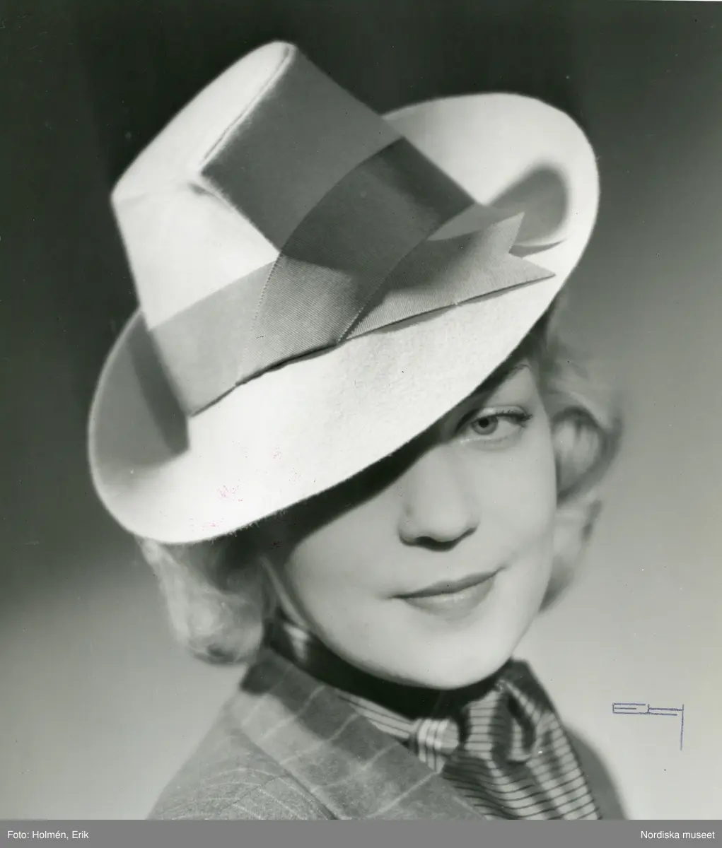 Porträtt av kvinna i ljus hatt med ripsband och uppvikt brätte baktill, från Rose Descat.