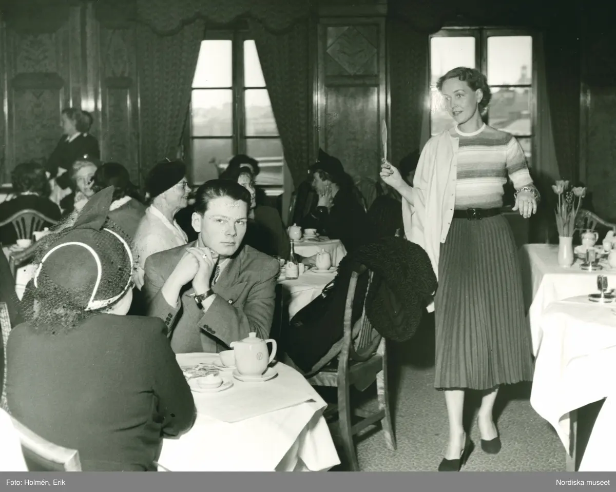 Modevsining på Nordiska Kompaniet. Modell klädd i randig jumper, kofta, plisserad kjol, skärp och pumps. Publik sitter vid runda bord.