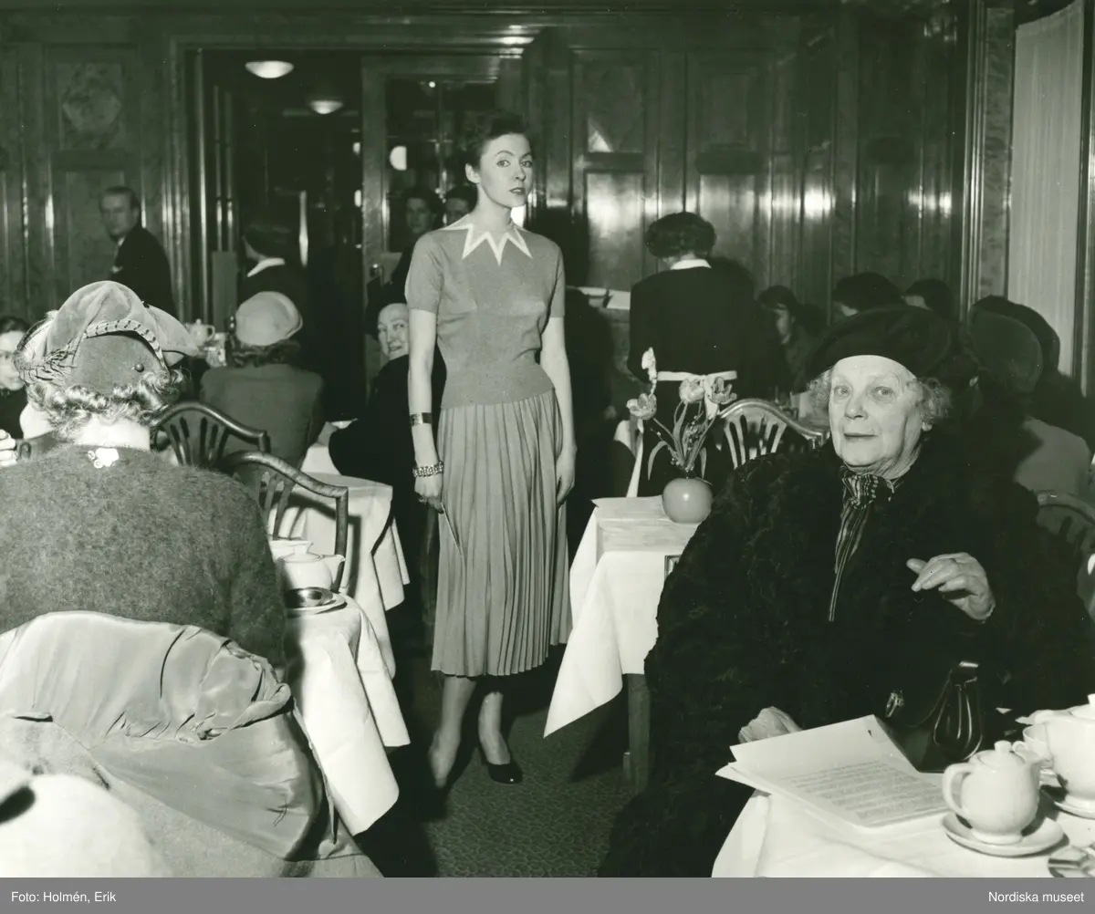 Modevisning på Nordiska Kompaniet. Modell klädd i kortärmad tröja, plisserad kjol och pumps.