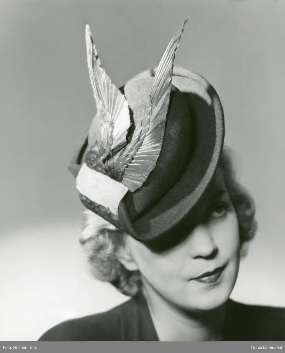 Porträtt av kvinna i filthatt med bladdekorationer, från Hermine Schattenfroh.