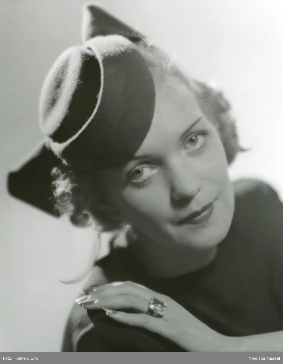 Porträtt av kvinna i hatt, mörk klädsel och ring.