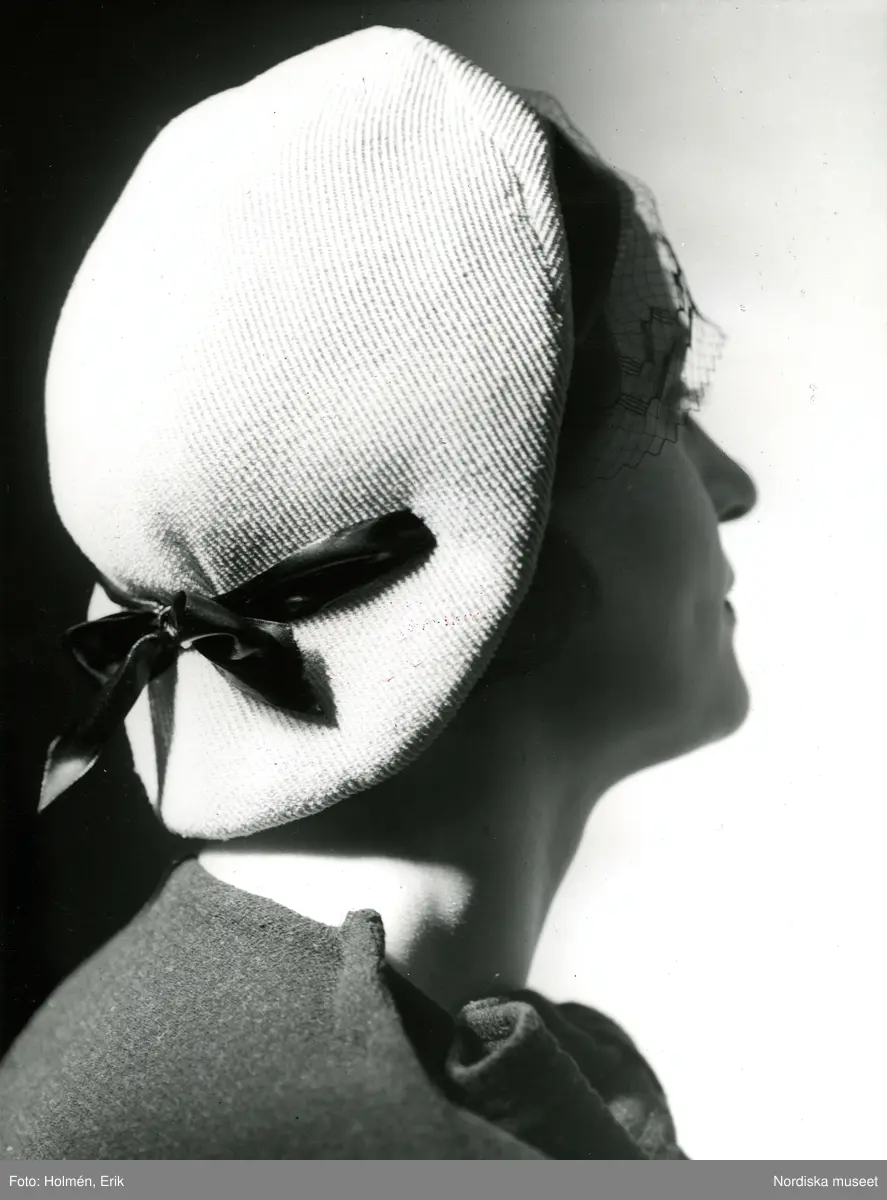 Kvinnlig modell i hatt med flor och rosett, Nordiska Kompaniet, Stockholm.
