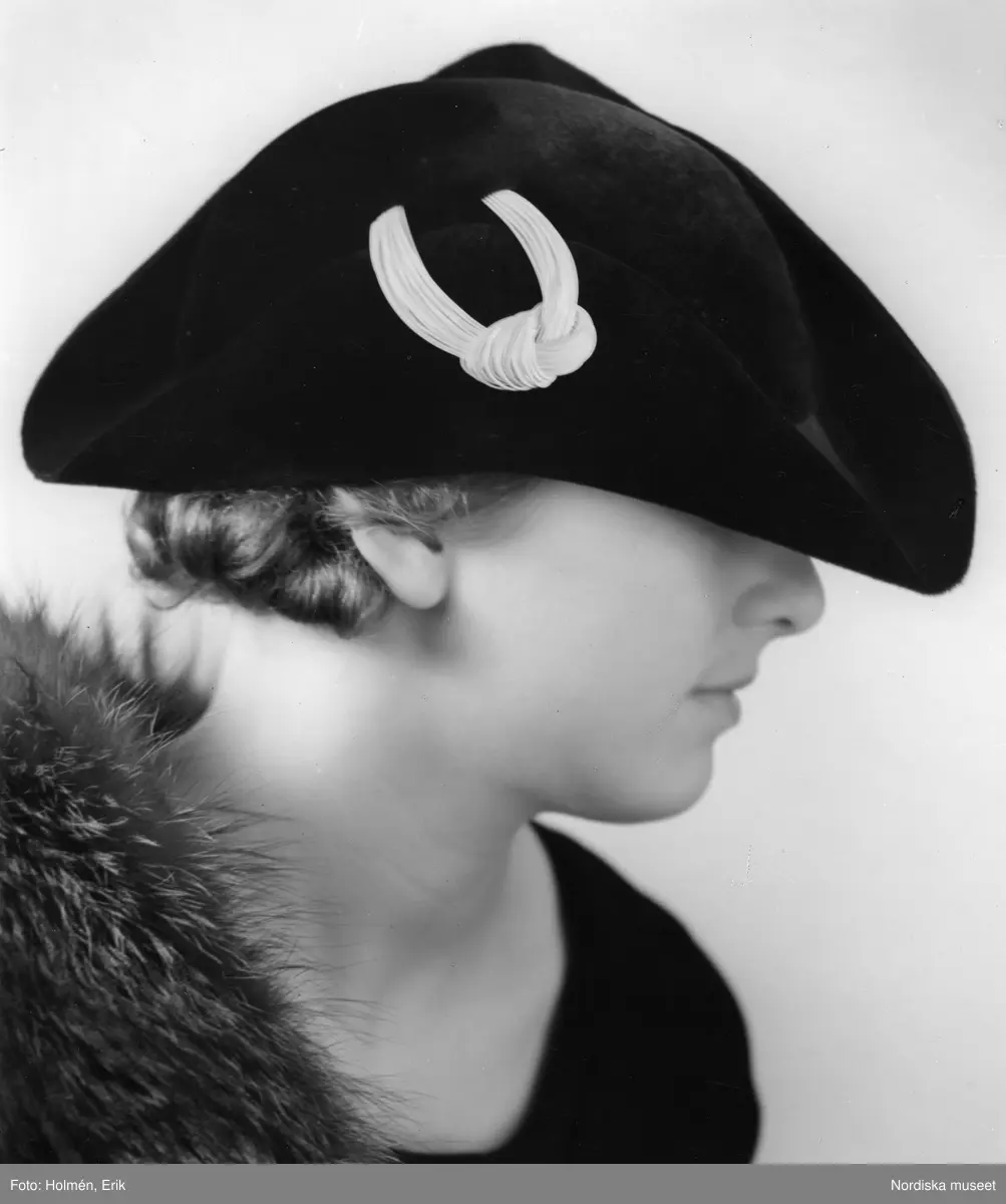Modell med hatt i svart velourfilt med tangofärgat garnityr. Egen atelier. Nordiska Kompaniet, Stockholm.