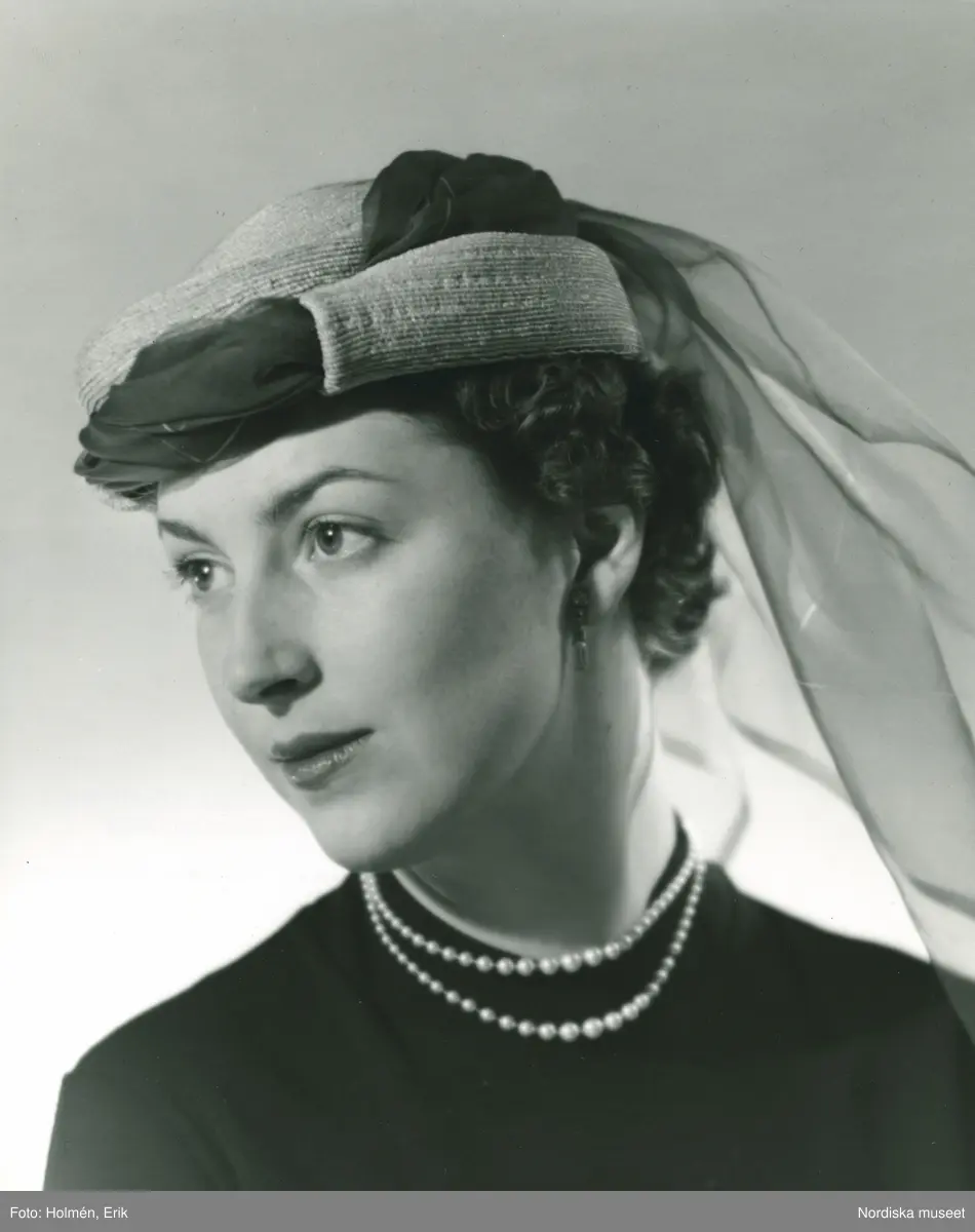 Porträtt av kvinna i guldfärgad stråhatt med tyll, av Marie Christiane.