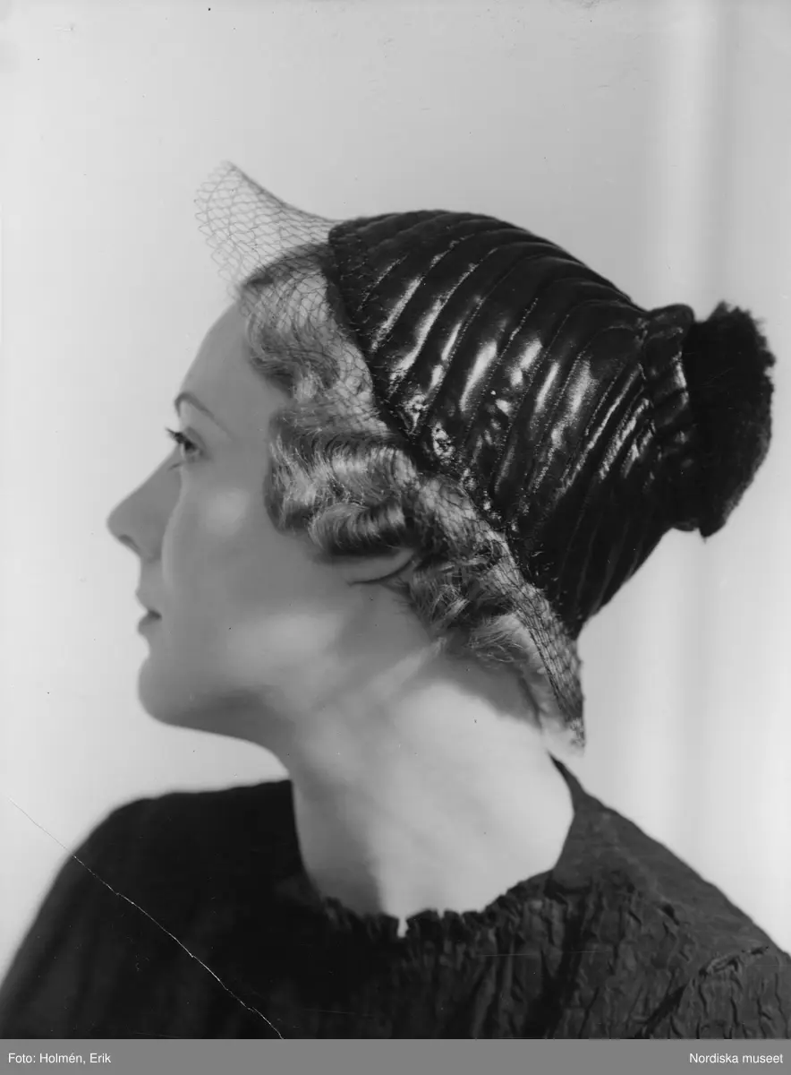 Kvinnlig modell i hatt med flor. Nordiska Kompaniet, Stockholm.
