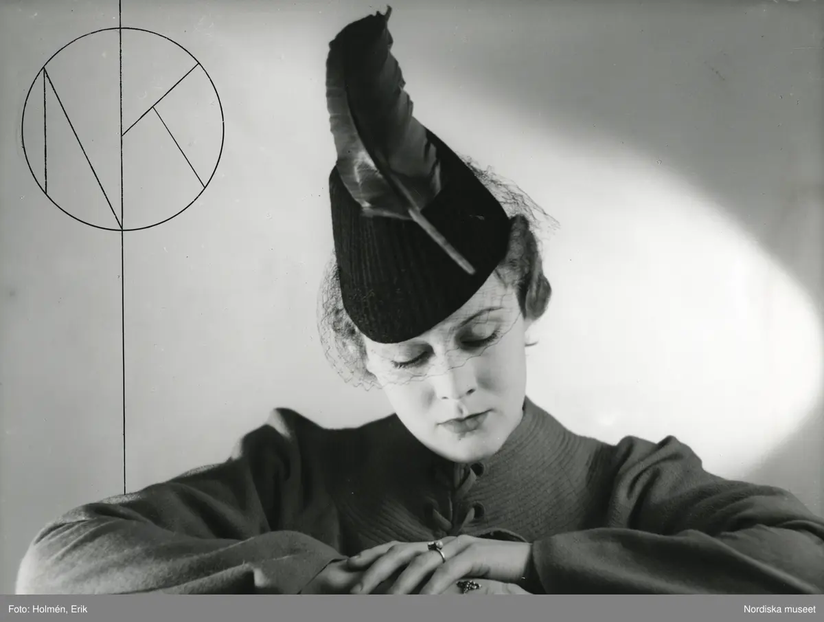 Kvinnlig modell i hatt med fantasi. Nordiska Kompaniet, Stockholm.