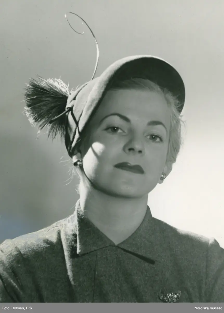 Porträtt av kvinna i natriabrun velourhatt monterad med ponpon i samma färg, av Maud Roser.