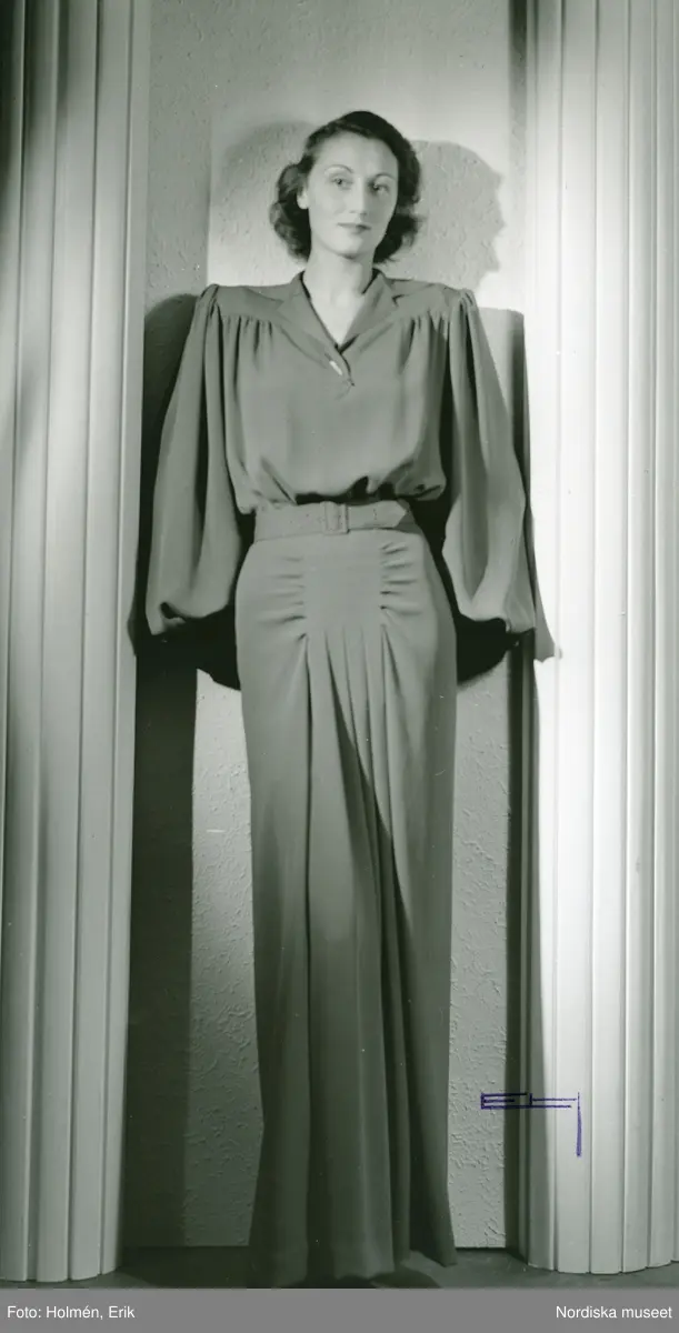 Helporträtt av en kvinna i långklänning med draperade detaljer.