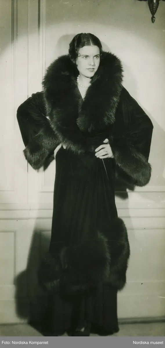 Modell i kappa, svart sammet och päls, från Jean Patou.