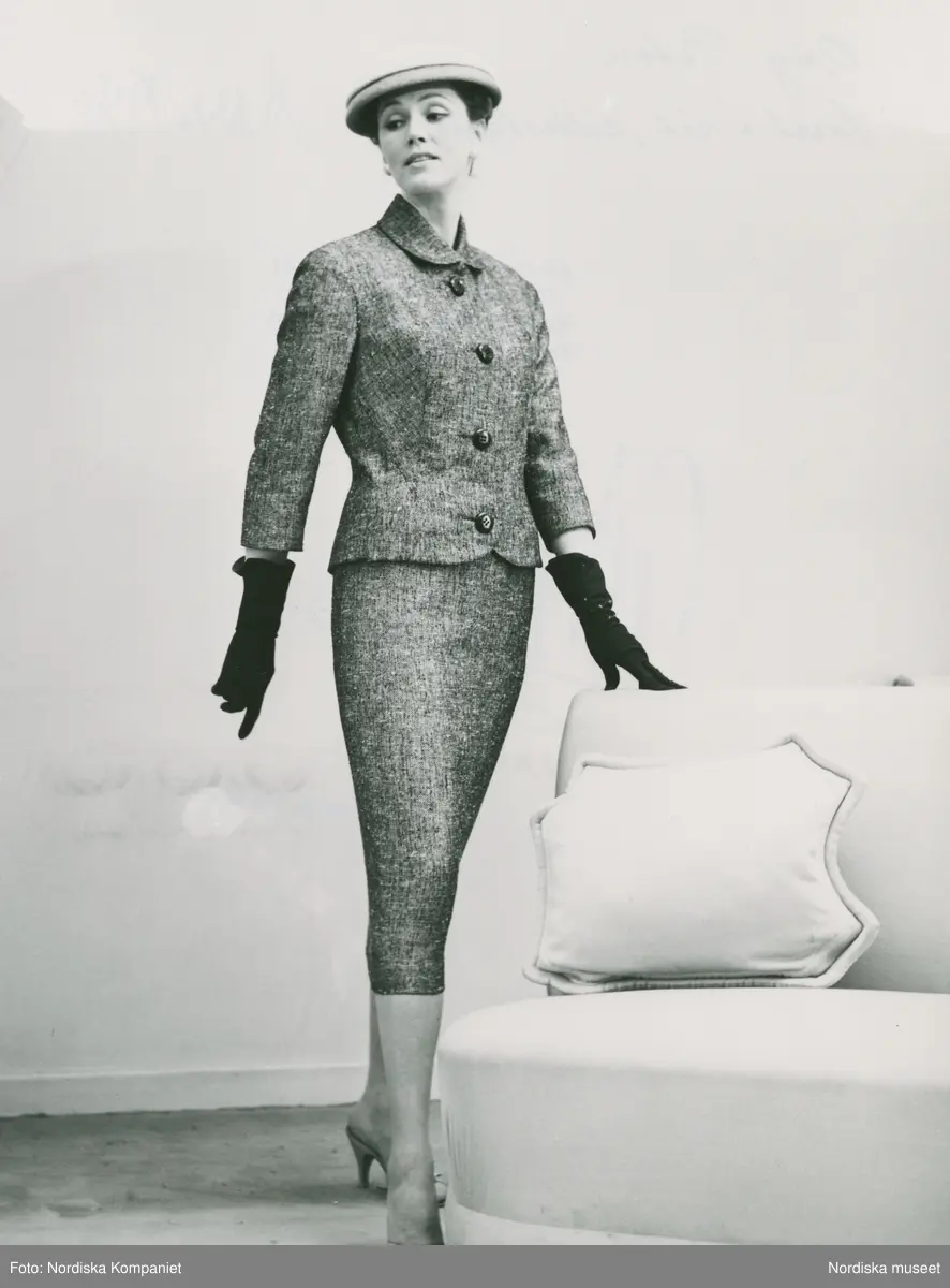 Mannekäng i dräkt, hatt, handskar och högklackade skor, vid en soffa. Original från Jean Patou, NK:s Franska damskrädderi.