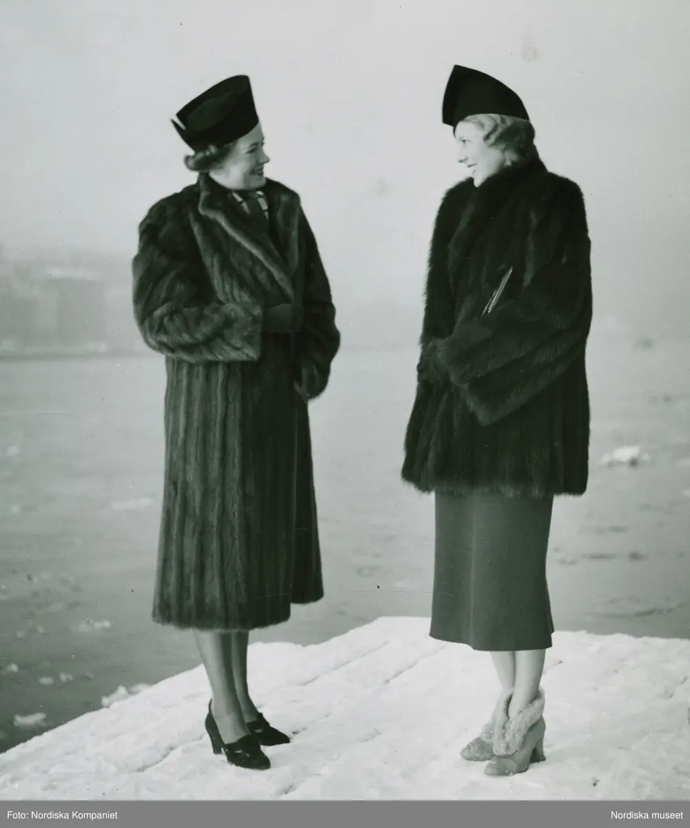 Två modeller i minkpäls och hatt vid vattnet. Kvinnan till vänster i lång kappa, kvinnan till höger i kortare jacka.