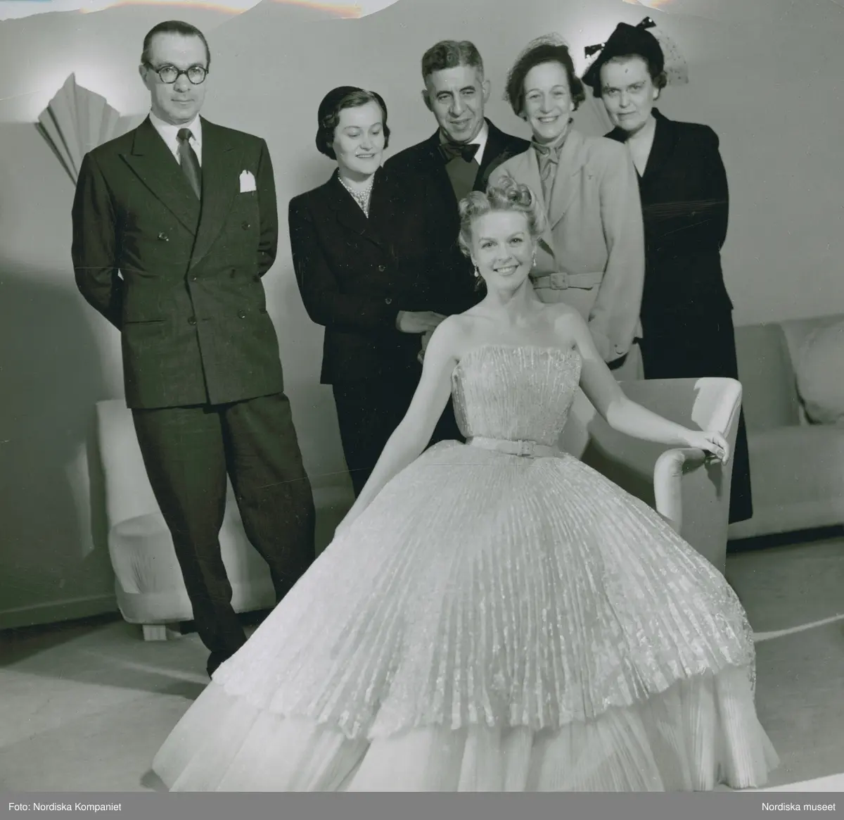 Friherrinnan Susanne Palmstierna poserar i den Diorklänning hon vunnit vid utlottning på NK:s Franska damskrädderi. Den ärmlösa klänningen har plisserat liv och kjol, midjan markerad med skärp. Underkjol av plisserad tyll. Bakom henne står juryn och till vänster en representant från Dior i Paris.