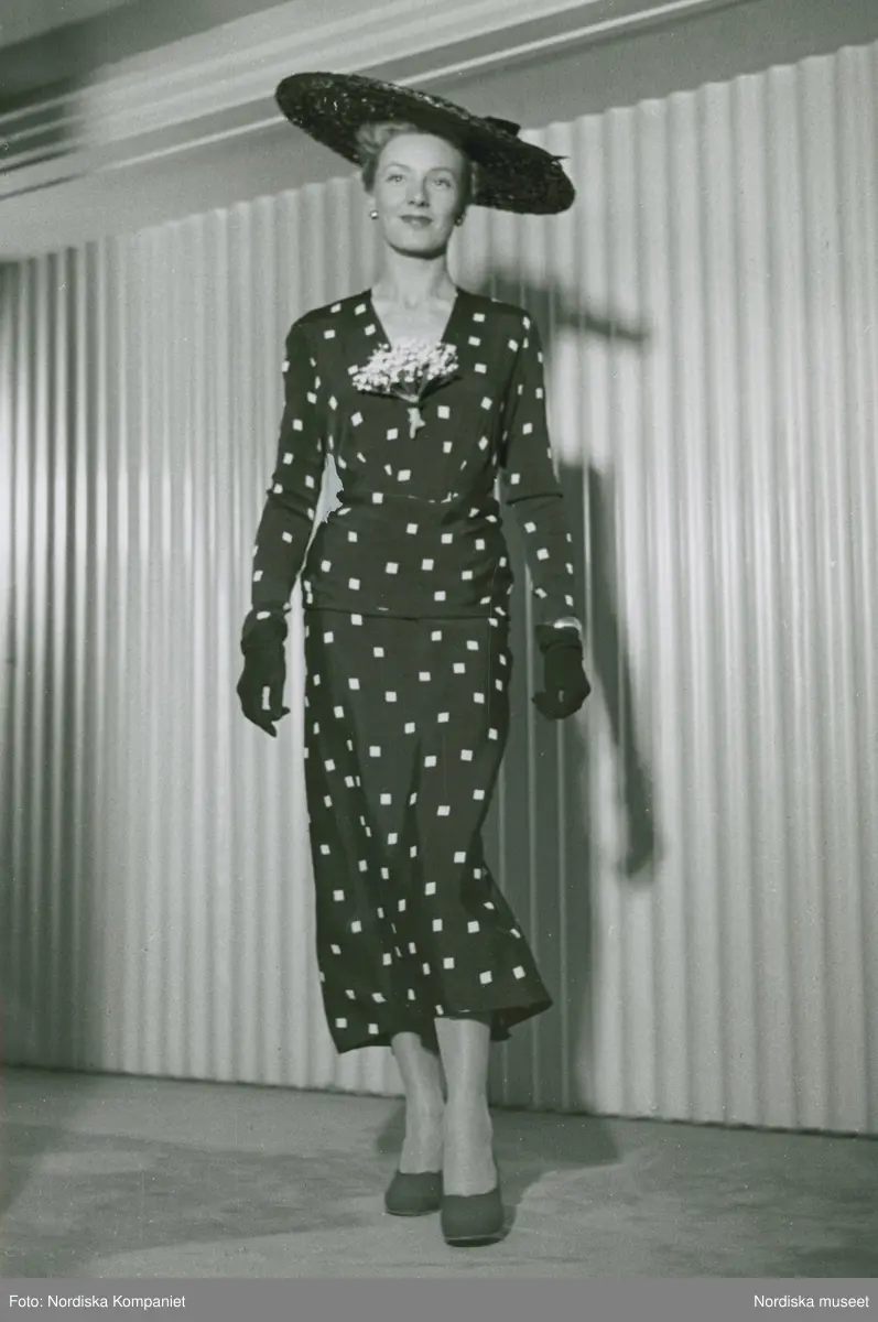 Modell i klänning med rutigt mönster och blomstergarnityr, stråhatt, handskar och pumps.