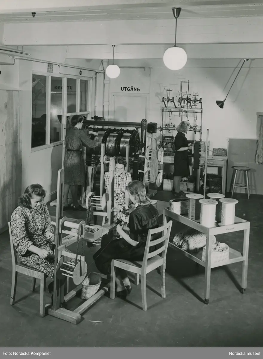 Interiör med kvinnor som spolar garn. Nordiska Kompaniet. Text med blyerts på baksidan: "CHV Interiör Okt. 1941