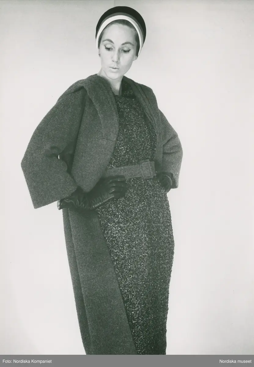 Mannekäng i klänning och kappa i grå ylle, hatt med ränder och handskar. J. Lafaurie, NK:s Franska damskrädderi.