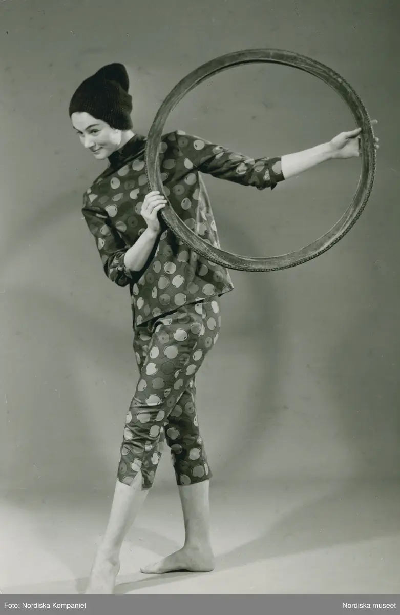Brud och Hem. Modell i tröja och byxor i tyg från Viola Gråsten, mössa och cykelhjul i handen.