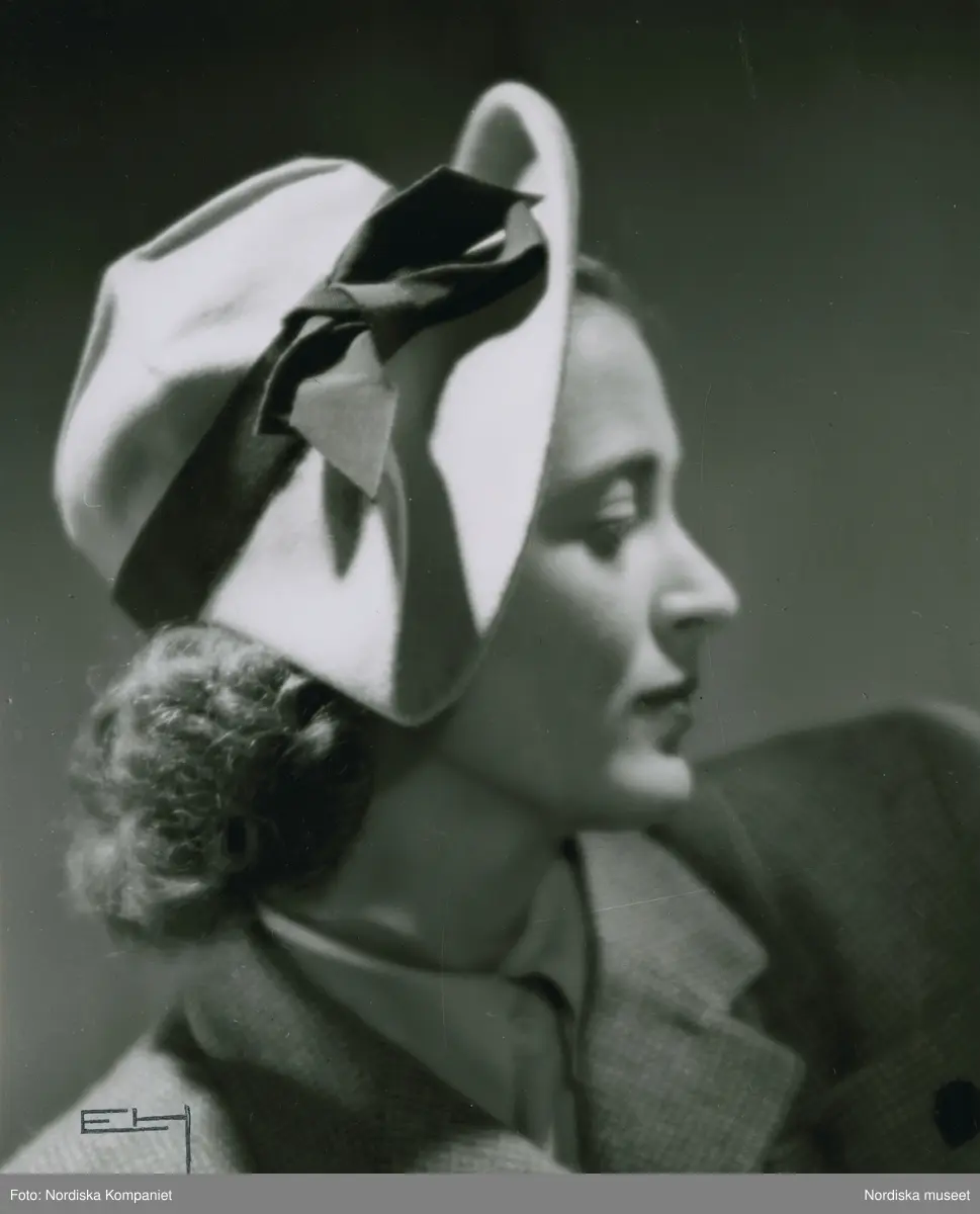 Modell i hatt med låg kulle och mjukt format brätte, hattband med rosett.