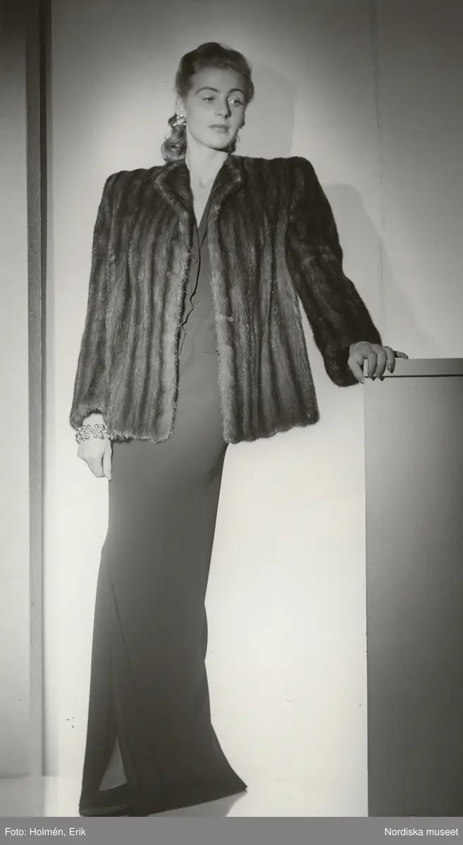 Nordiska Kompaniet. Kvinna i aftonklänning och höftlång pälsjacka.