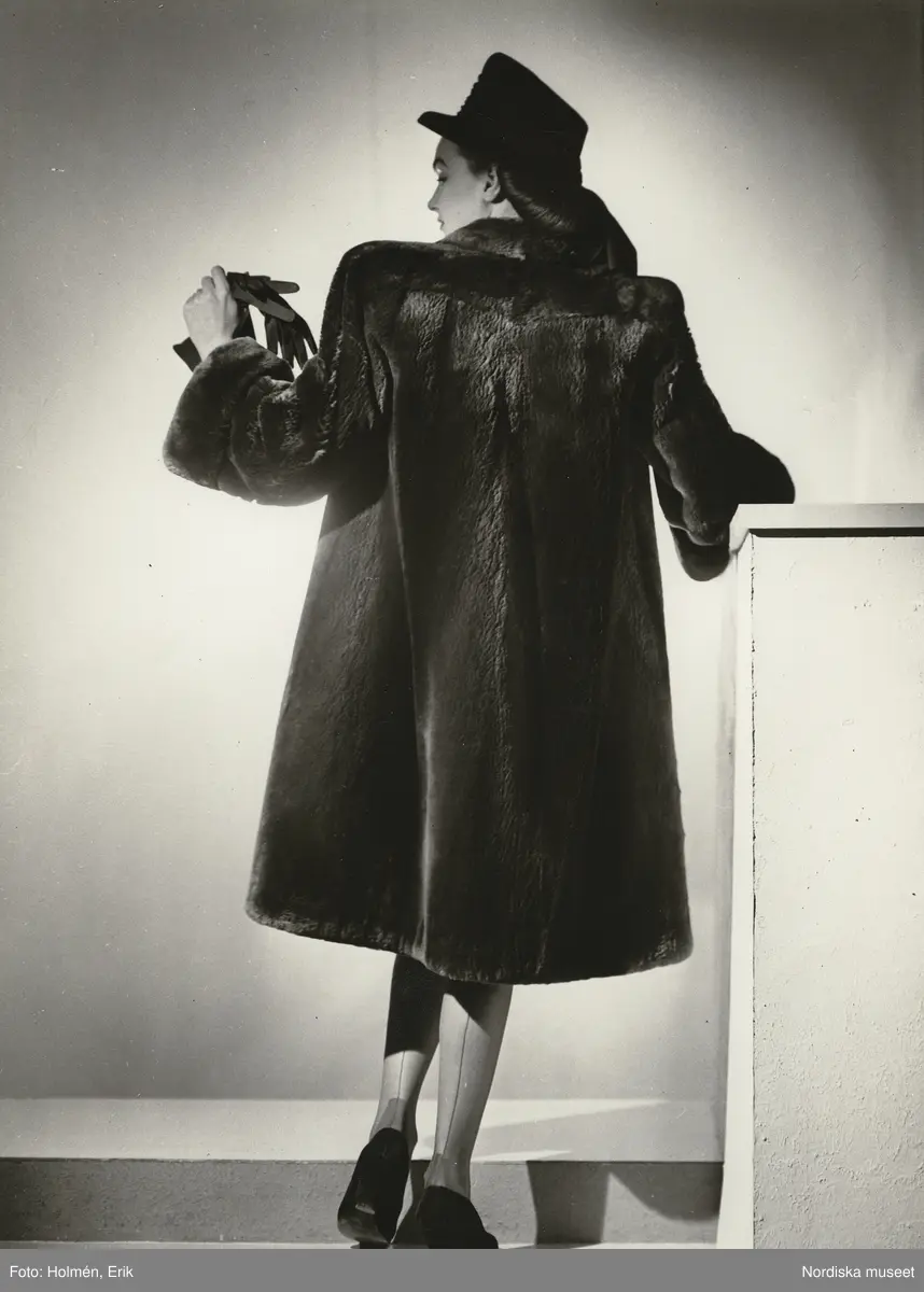 Nordiska Kompaniet. Kvinna i mörk päls och hatt. Strumpor med sömmar. Text på baksidan: "Bäverpäls 1945".