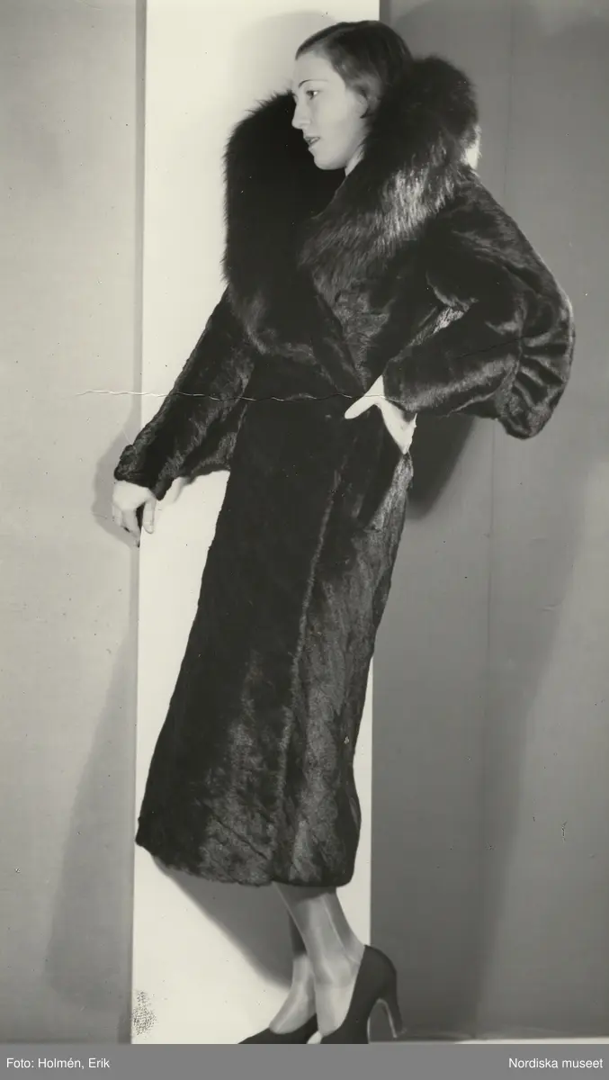 Nordiska Kompaniet. Kvinna i mörk päls med hög, vid krage. Text på baksidan: "Pälsar år 1932. Färgad hermelin i svart".