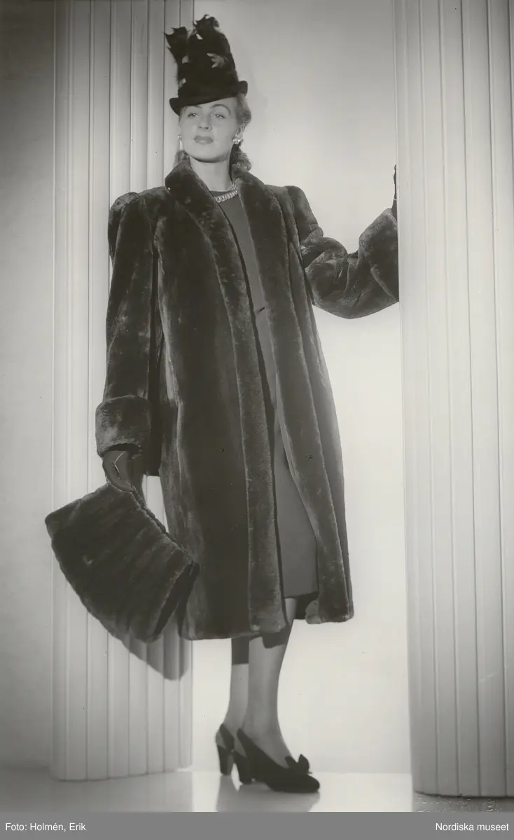 Nordiska Kompaniet. Kvinna i mörk päls och svart hatt med fjädrar. I ena handen en pälsmuff. Text på baksidan: "Arkivbild d. 21/8 45"