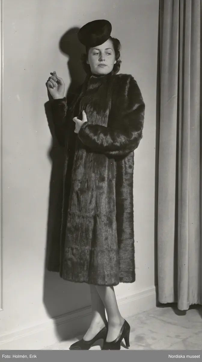 Nordiska Kompaniet. Kvinna i mörk päls och hatt. Text på baksidan: "Färgat Gråverk, Horwitz London".