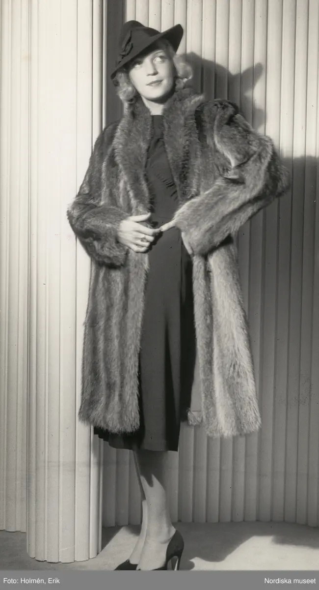 Nordiska Kompaniet. Kvinna i skiftande pälskappa och svart hatt.