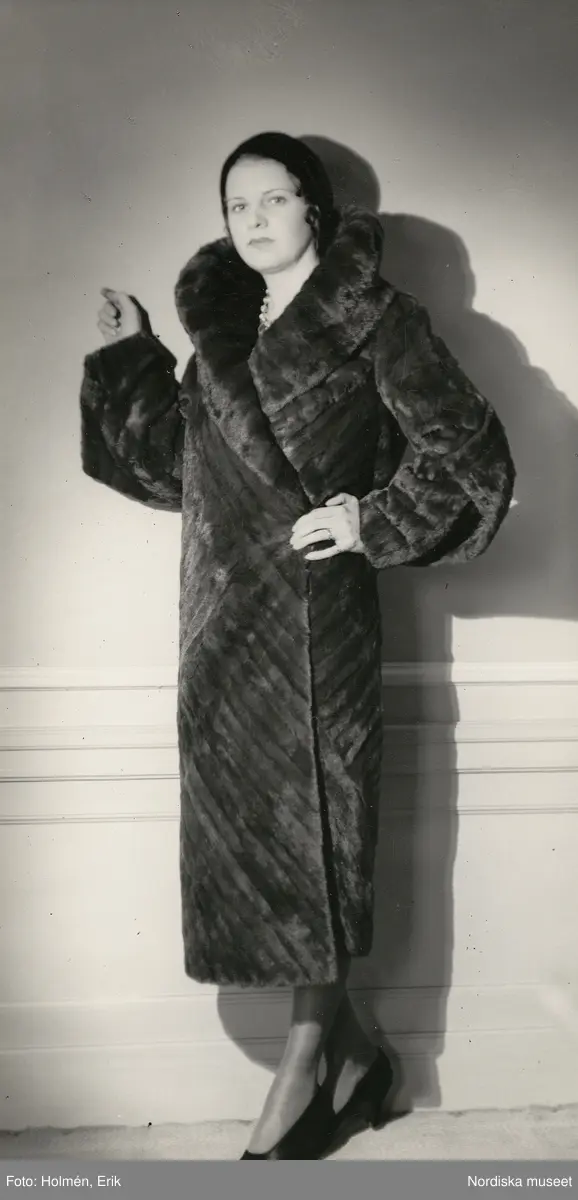 Nordiska Kompaniet. Kvinna i diagonalmönstrad päls med bred och hög krage. Text på baksidan: "Sobelfärgad hermelin"