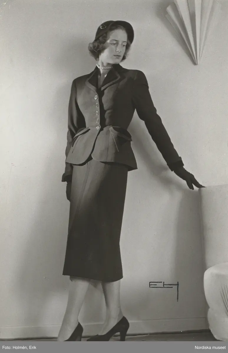 Modell i dräkt, hatt, pumps och handskar.