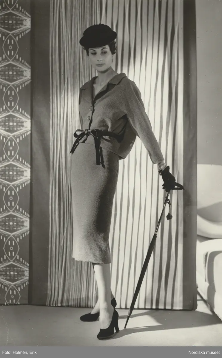 Modell i dräkt med skärp, hatt, handskar och paraply.