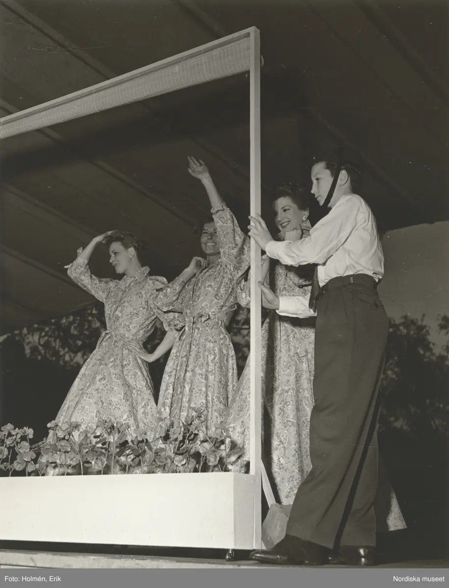Tonårsmodevisning i Kungsträdgården i Stockholm, Nordiska Kompaniet. Tre kvinnor i mönstrade klänningar och man i vit skjorta, hatt med hakband och mörka byxor.
