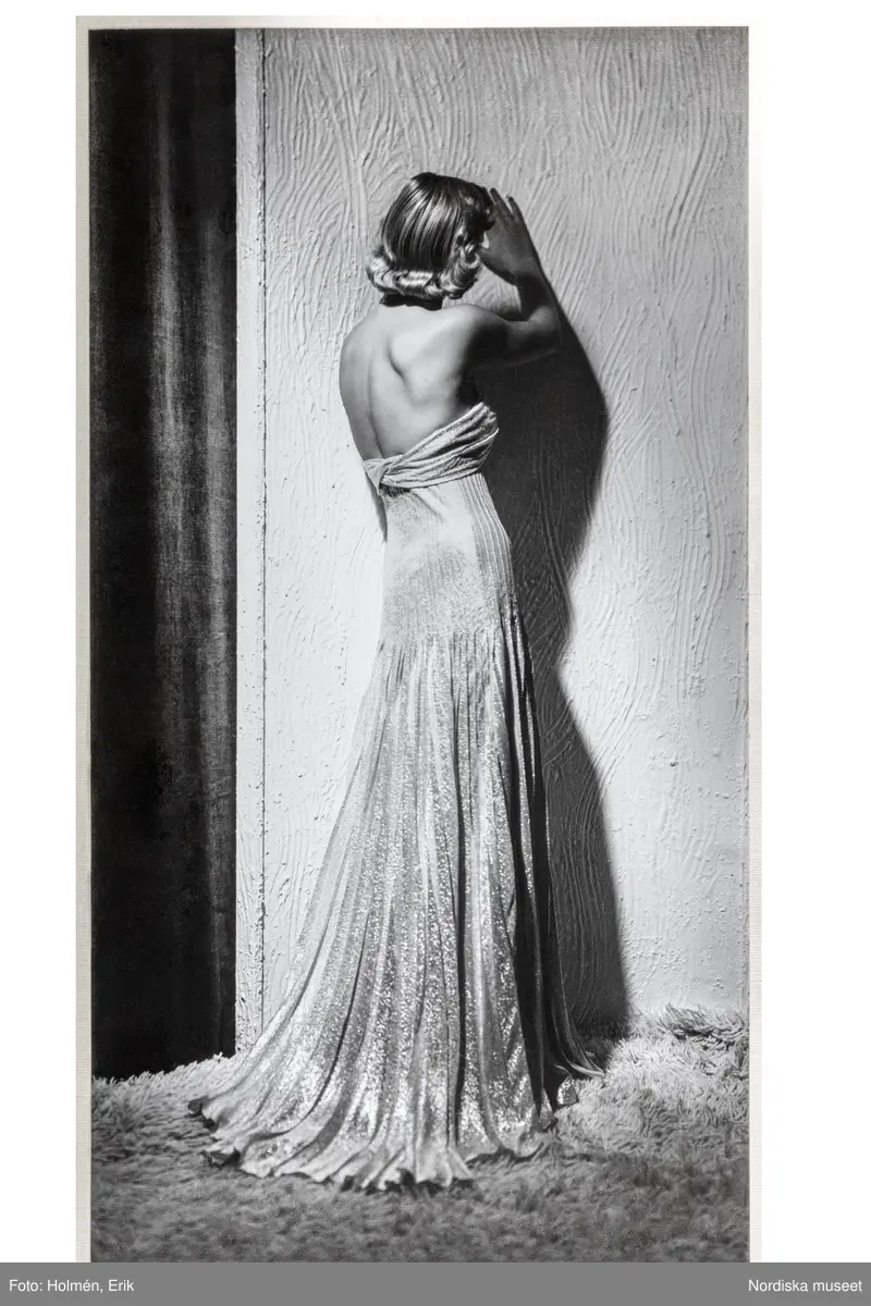 Mannekäng visar aftonklänning med ryggen i fokus. Klänning med bar rygg och utan axelband. Drapering vid bysten och ryggen, figurnära över liv och höft, från höften rynkad, hellång kjol med litet släp. Glittrigt tyg. NK:s Franska damskrädderi.
