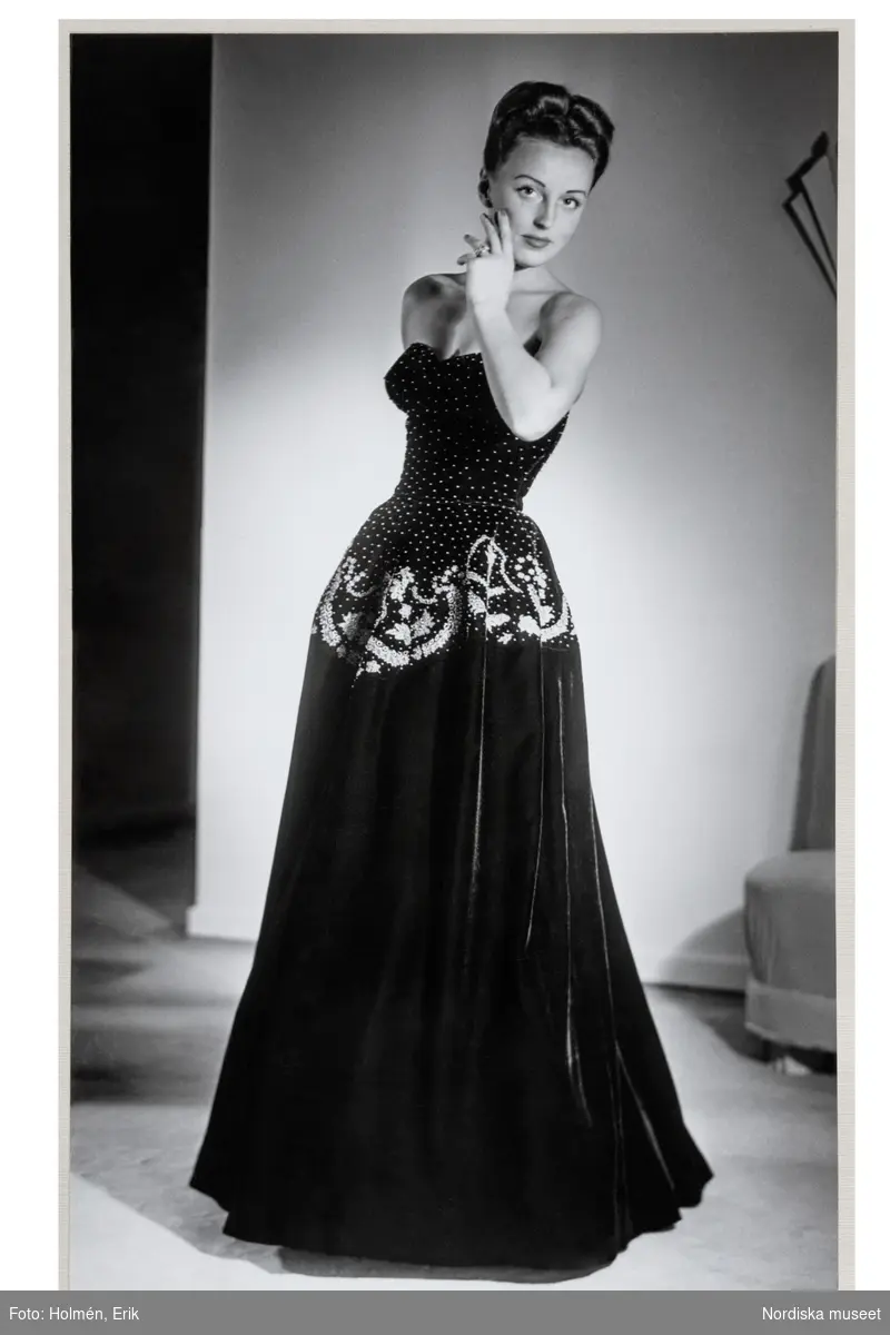 Mannekäng visar festklänning. Hellång klänning, ärmlös med åtsittande liv och vid kjol. Sammetstyg med dekorationer på liv och höftparti. NK:s Franska damskrädderi, från Jacques Fath. Klänningen bakifrån se NMA.0099292