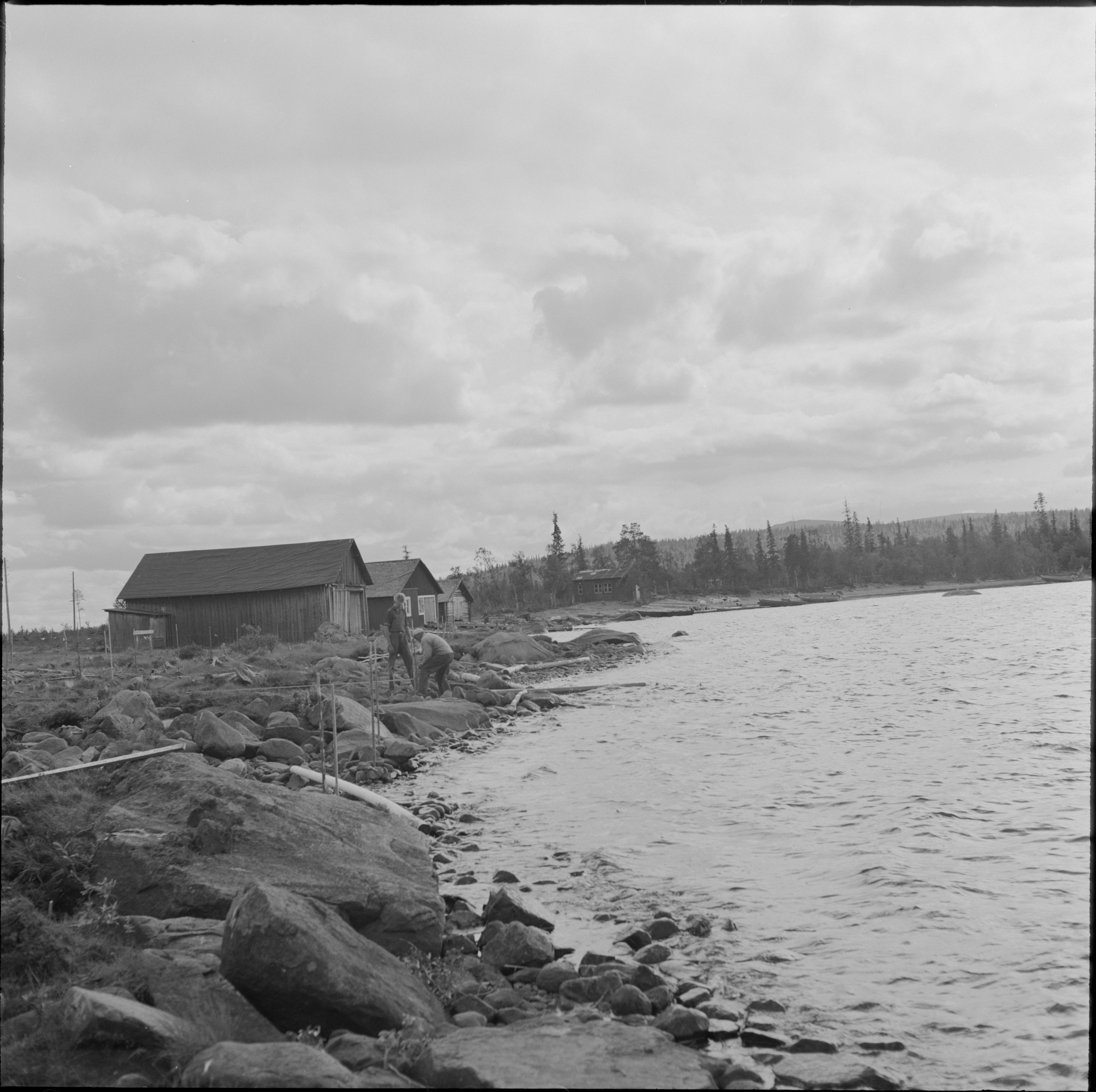 Karats. Uppsättning av baslinjen på södra delen av lokalen. I bakgrunden båthus och sjöbodar.