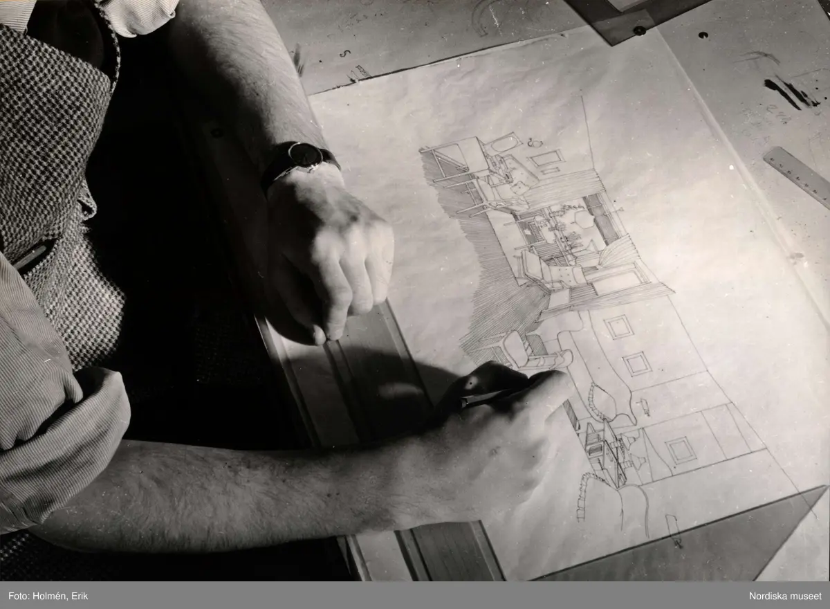 Man med uppkavlade skjortärmar arbetar med skiss av möblerad hemmiljö vid ritbord. Nordiska Kompaniet i Stockholm.