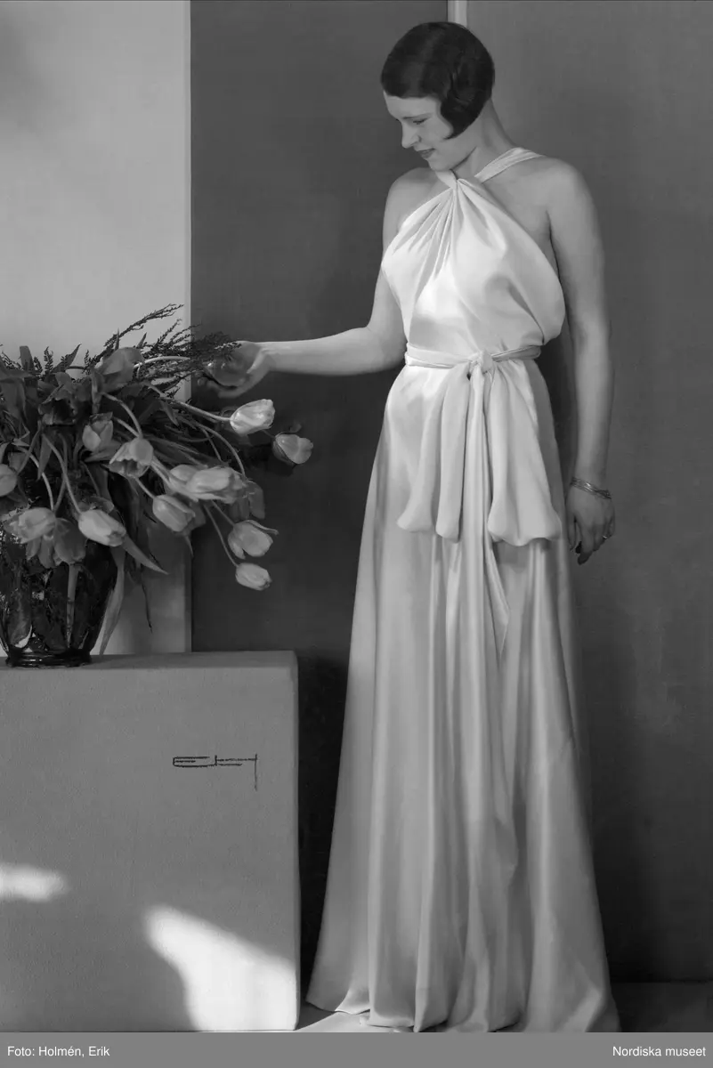 Modell poserar i en ljus långklänning. Nordiska Kompaniet.