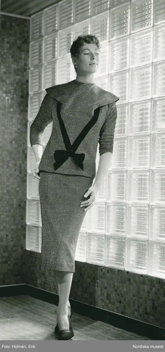 EM, Modellbutiken, Nordiska Kompaniet. Uppvisning i lunchrummet. Damkonfektion. Modell i tröja och kjol i metalljersey med svart rosett, framför vägg av betongglas.
