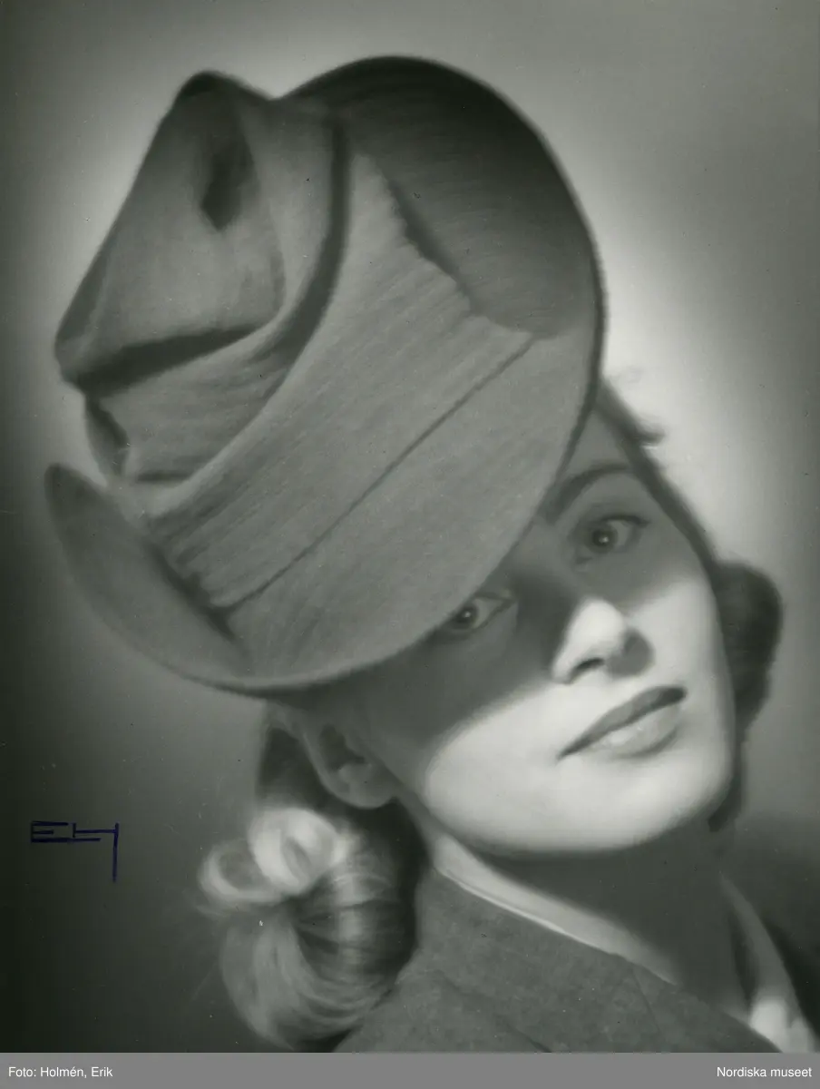 Porträtt av kvinna i hatt med pösig kulle och uppvikt brätte baktill, från Rose Valois.