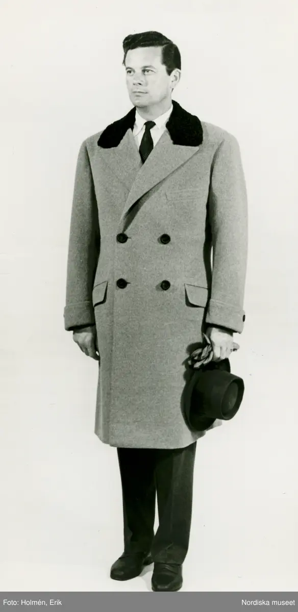 Helporträtt av en man i kappa med dubbelknäppning, hatt och handskar i handen.