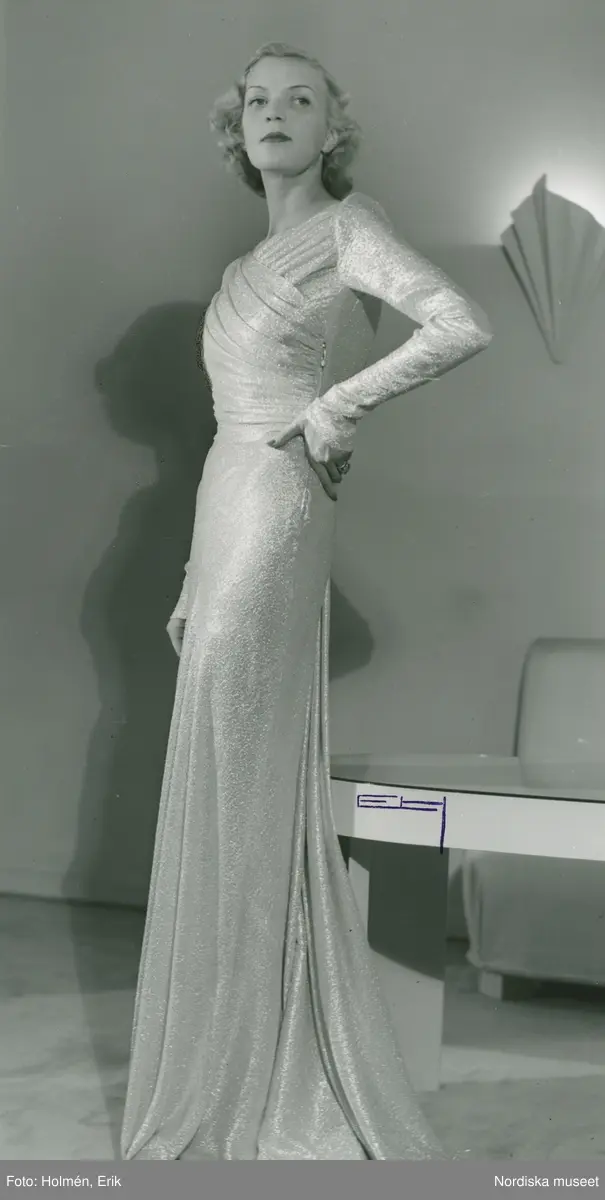 Helporträtt av kvinna i hellång klänning med omlottöverdel.