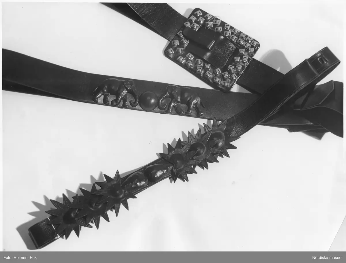 Tre skärp från Paris. Spännen av arbetat skinn. Skärpen garnerade med blommor och djur.