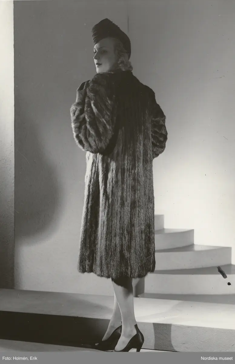 Nordiska Kompaniet. Kvinna i mörk minkpäls och hatt. Text på baksidan: "Pälsar jan. 1942 (fru Margit Langlet).