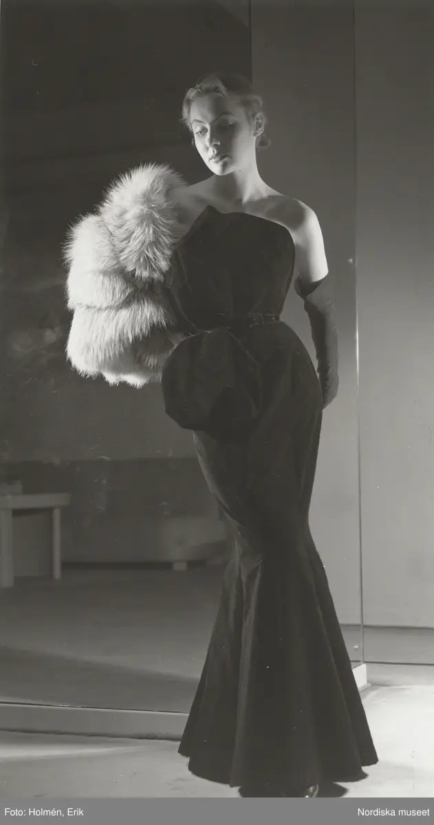 NK:s Franska damskrädderit. Mannekäng, möjligen Ulla-Britt Enzell senare gift Gregemark (1953), i mörk, snäv aftonklänning, utsvängd från knäna. Ljus pälsboa/muff över ena axeln. Text på baksidan: "Kgl från J. Fath muff av platinaräv. NK. Nov 1950"