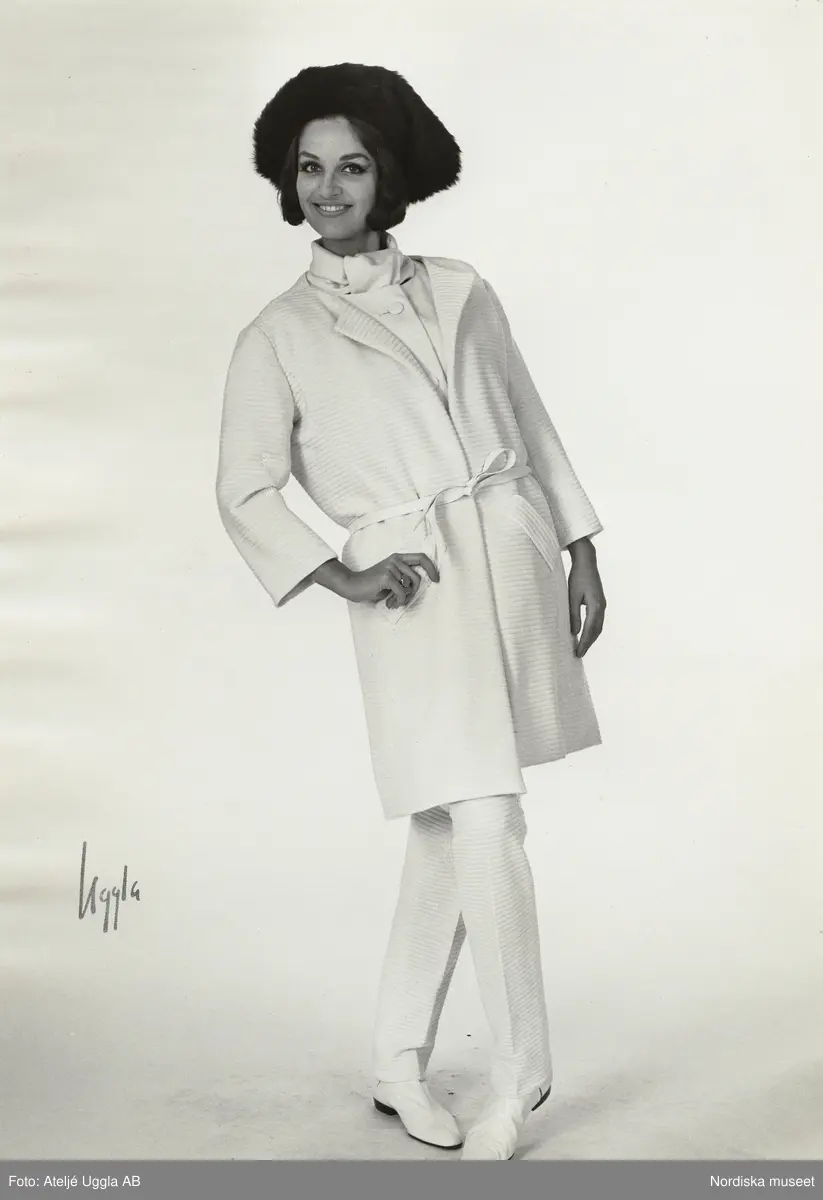 Modell i kappa och byxor i vit jersey, platta skor och hatt. NK:s Franska, original från Courrèges, höst.