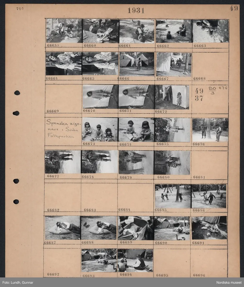 Porträtt av barn, barn leker med gungor, en man ligger på marken och röker pipa, ett barn i en barnvagn, vy över ett tältläger.