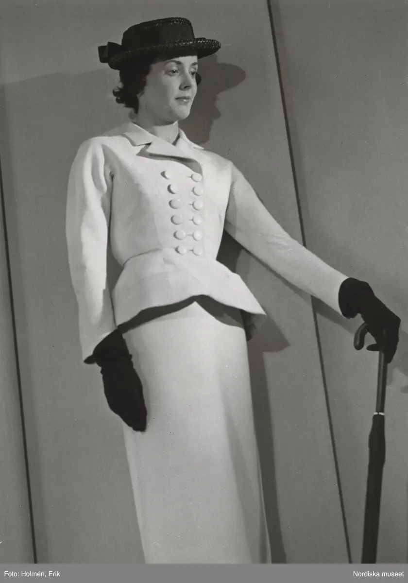 Nordiska Kompaniet. Kvinna i ljus dräkt och mörk hatt med band och rosett. Insvängd jacka med dubbla knapprader, rak kjol, mörka handskar. I ena handen ett paraply. Text på baksidan: "mars 1950"