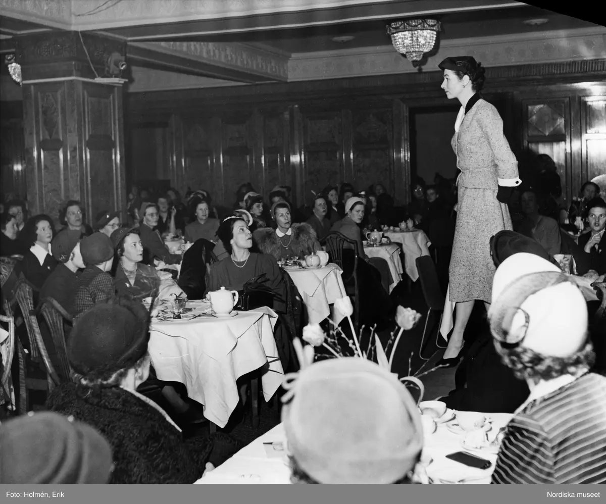 Damkonfektionsvisning i lunchrummet på Nordiska Kompaniet. Modell står på ett podie klädd i ljusgrå dräkt, svart hatt och svarta pumps. Publiken sitter vid uppdukade bord med NK-servis, vita dukar och tulpaner.