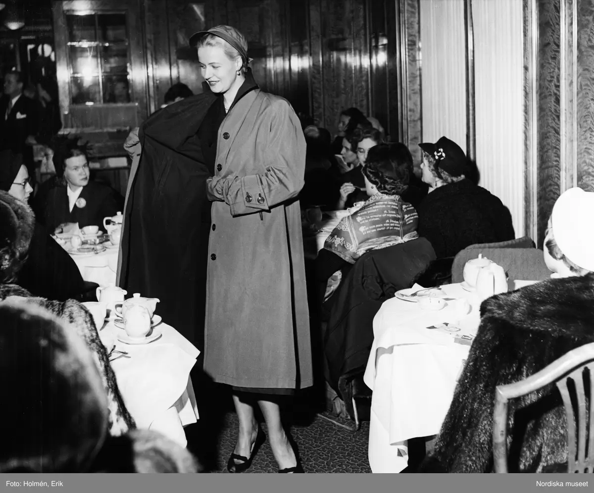 Modevisning i lunchrummet på Nordiska Kompaniet. Modell klädd i regnkappa, hatt och klackskor med öppen tå visar upp kappans insida för åskådarna.