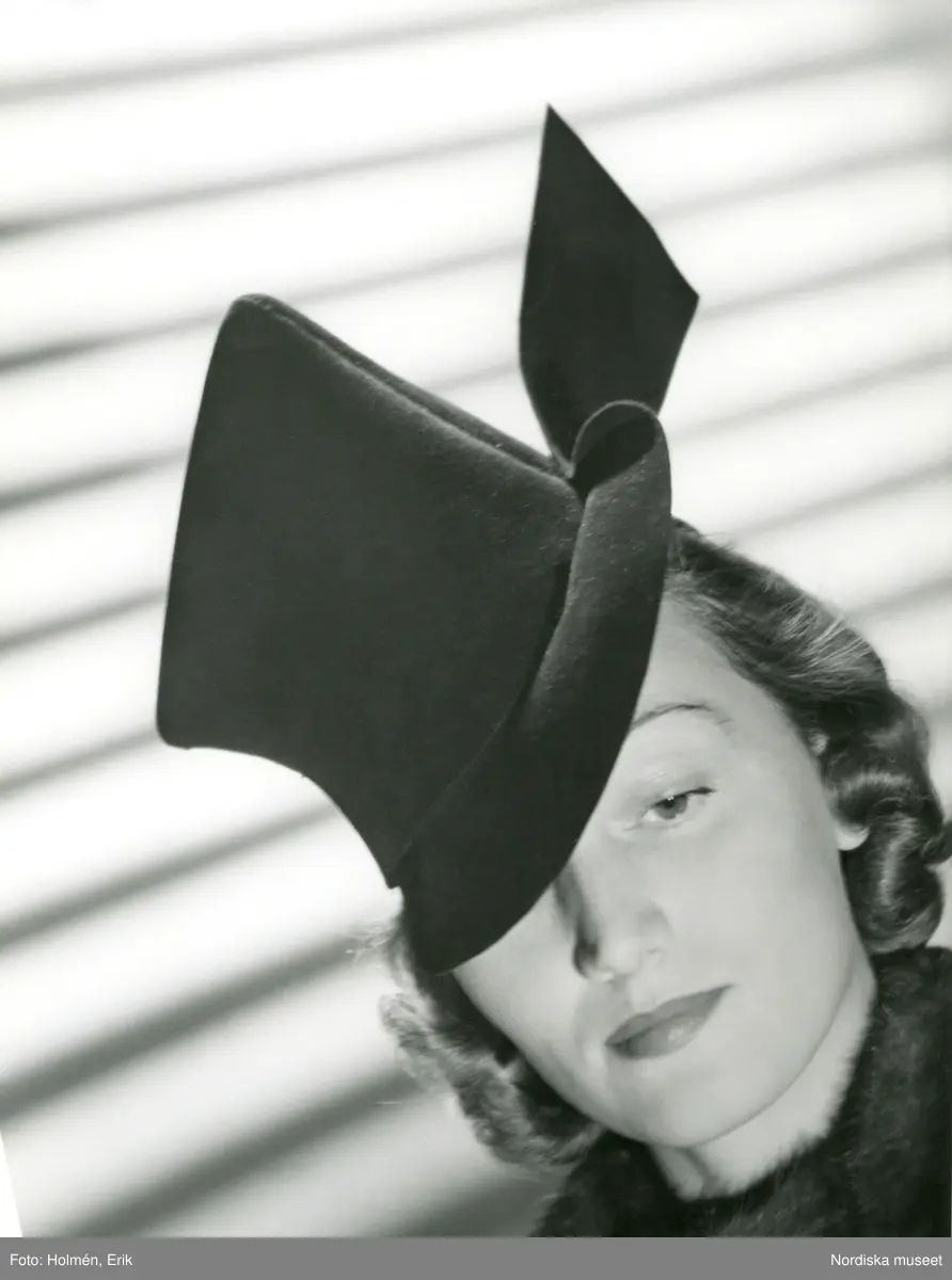 Porträtt av kvinna med hatt i filt av Marie Alphonsine. Randigt ljusmönster i bakgrunden.