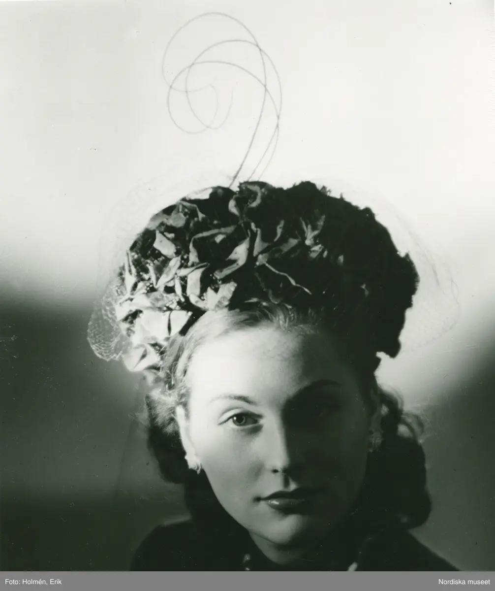 Porträtt av kvinna i hatt med flor och metallfjädrar.
